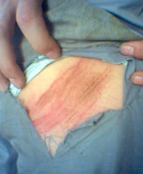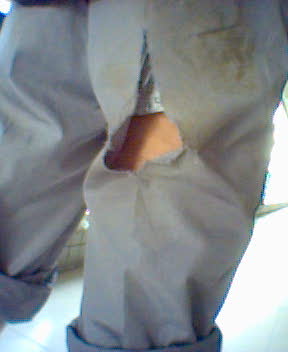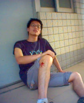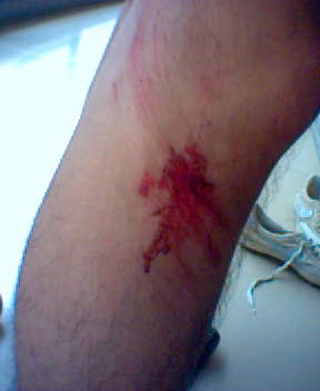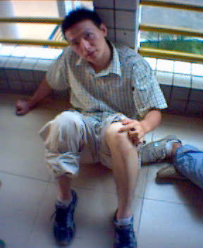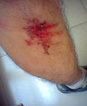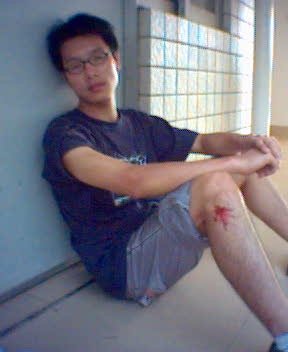 秋光先下去了,他们几个建议不从那里下,不过要走回头,我等不了了,就冒险下去,那时坐脚都在抖啊抖的,最后心一横,冲,右手伸向那根铁桩,但是惯性太大了,来了个转身,结果双臂擦伤了,屁股开花了,小腿也烂了……惨不忍睹啊!!