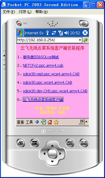 5、打开“Pocket PC 2003 SE仿真程序”浏览器,在地址栏输入本地计算机的IP地址,若配置无误,则会出现一个HTML页面,按顺序安装。